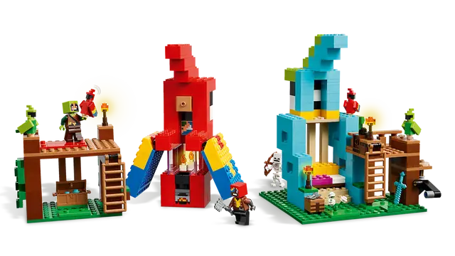 Lleva la jungla a tu interior con el set de juego LEGO Minecraft Casas de Loros (21282) para niños y niñas a partir de 8 años y fans del popular videojuego. Este set de construcción LEGO Minecraft de alta calidad permite a los jugadores construir, jugar y exhibir dos casas de loros construibles. La casa roja para loros cuenta con alas batientes, un cofre de almacenamiento y un barril en su interior, y se puede separar del set para jugar por separado. La casa azul para loros contiene una gramola con un disco de música e incluye una función que hace bailar a los dos loros. El set incluye minifiguras de Guardabosques y Adiestrador de Loros, 2 loros rojos, 2 loros verdes y un esqueleto. Una espada de diamante, un hacha, un cofre, un mapa, semillas de trigo, carbón, diamantes, granos de cacao, tijeras, antorchas y otros accesorios de juego inspiran el juego imaginativo de los niños. Para la diversión digital, la app LEGO Builder permite a los niños ampliar, rotar modelos en 3D y seguir su progreso. Contiene 535 piezas.
